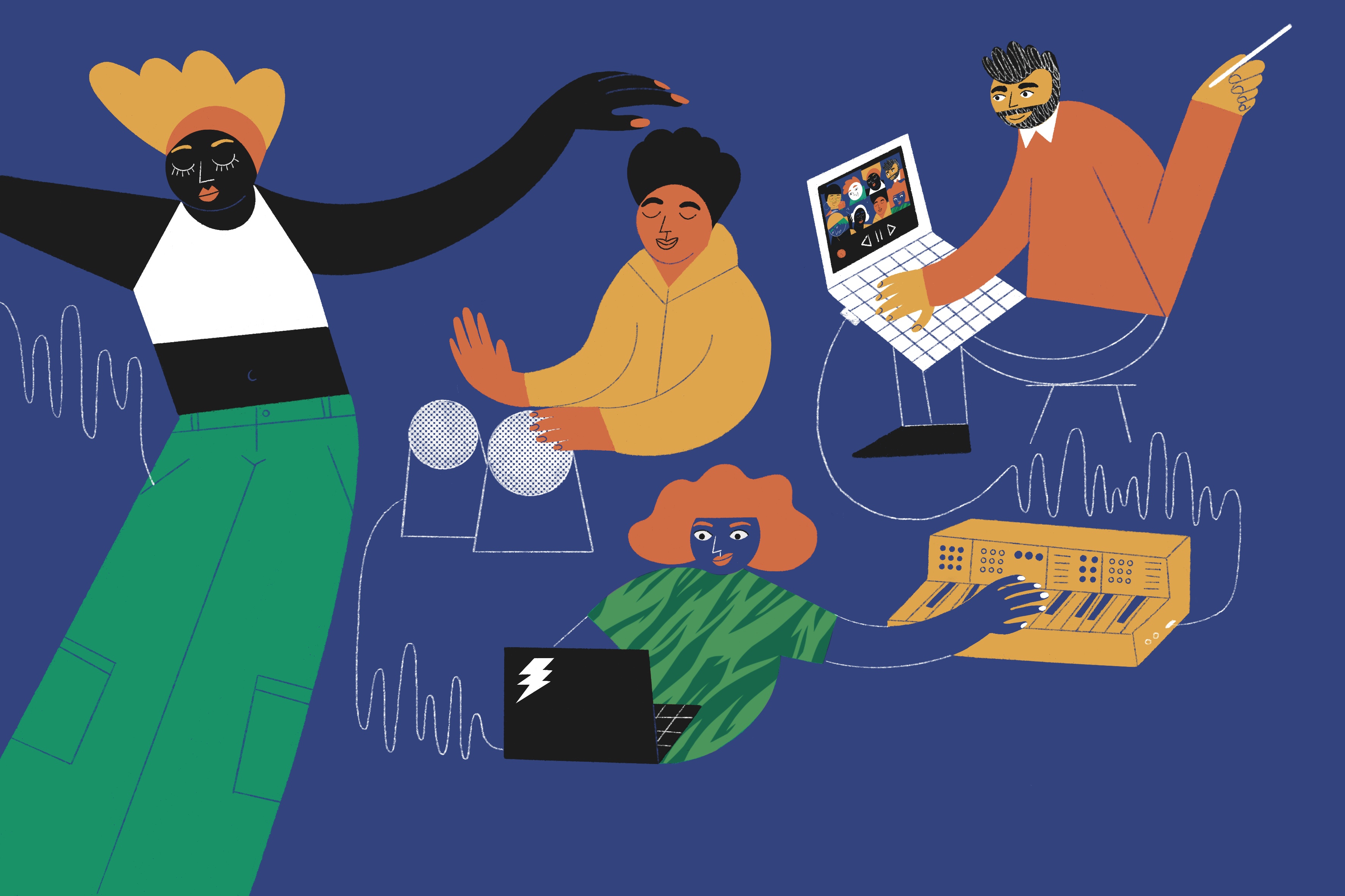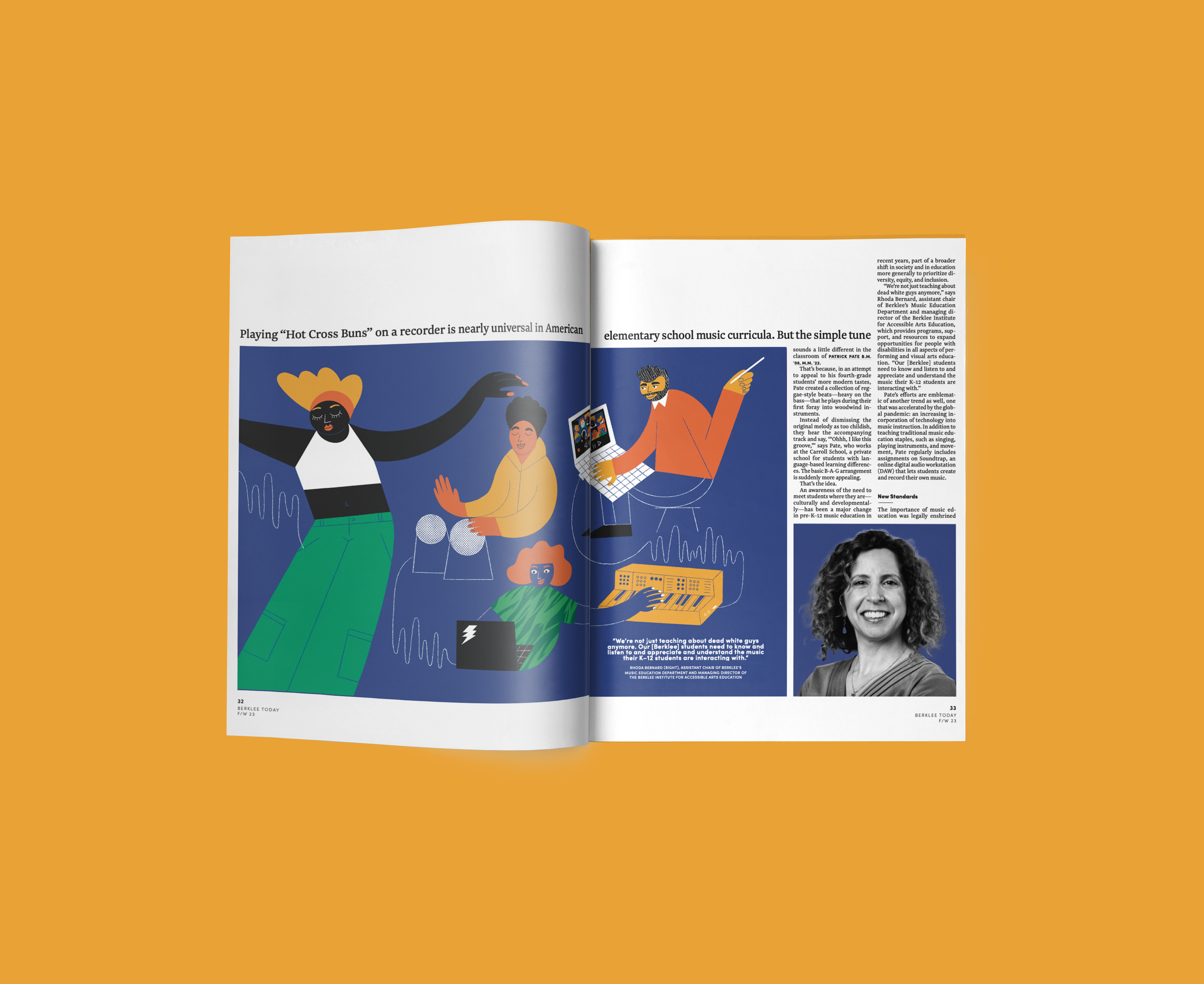 Double-page illustrations for the latest issue of the Berklee Today magazine on the use of technology and digital media applied to music education in the school environment.